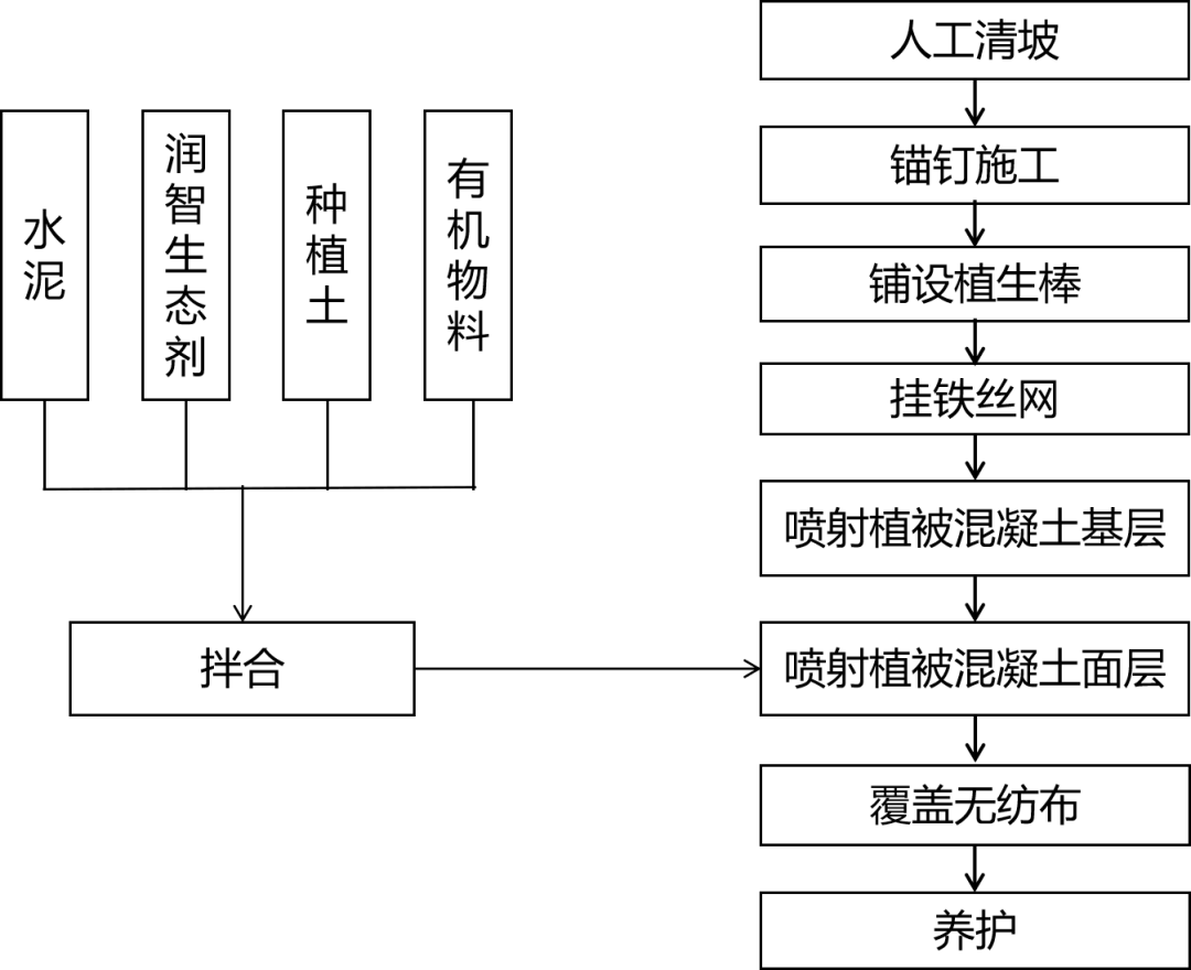 左壩肩邊坡位于左壩壩肩,面積約2200m2,最大高約39m,分三級,坡度40~70°。本邊坡采用植被混凝土生態(tài)恢復技術(shù);馬道沿外側砌筑擋土埂形成種植糟,種植槽內覆土種植迎春(或薔薇)和爬山虎。
